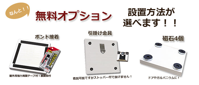 ボンド接着式・引っ掛け金具式・磁石式の中から、お好みの取り付け方法を選べます